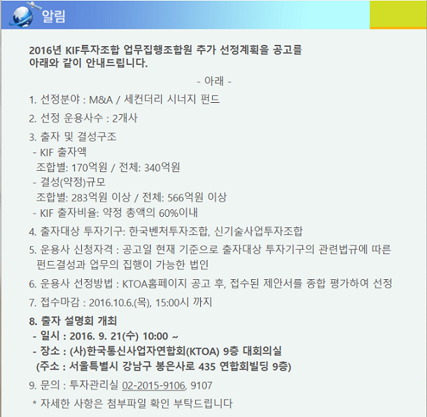 KIF투자조합 업무집행조합원 추가 선정계획 공고문